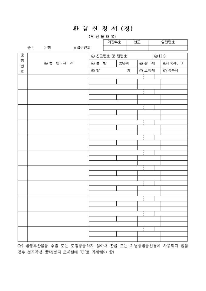 9,000원/월행번호, 품명, 규격, 신고번호 및 란번호, HS, 물량, 단위, 관세, 내국세, 교육세, 농특세 등을 기록하는 환급신청서(정) 양식입니다.
