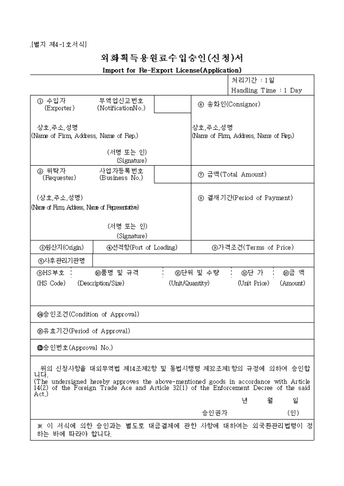 외화획득용원료수입승인(신청)서Import for Re-Export License(Application)