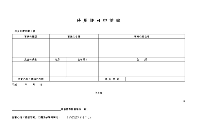 9,000원/월사업종류, 명칭, 소재지, 아동성명, 성별, 생년월일, 주소 등을 기록하여 신청하는 아동사용허가신청서(일어) 양식입니다.
