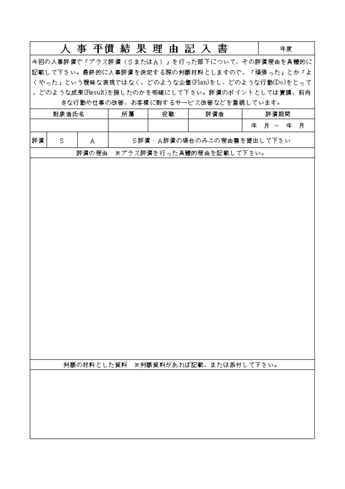 9,000원/월대상자에 대해 성명, 소속, 역직, 평가자, 평가기간 등을 기입하는 인사평가결과이유기입서(일어) 양식입니다.
