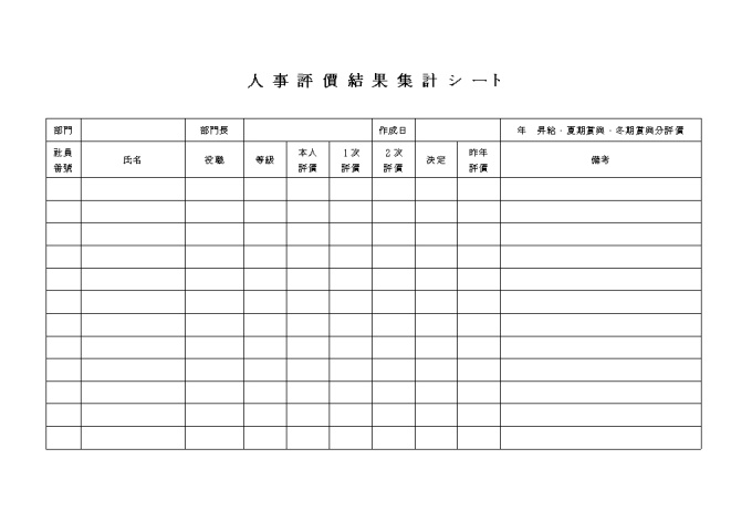 9,000원/월사원번호, 성명, 직위, 등급, 평가, 결정, 작년평가 등을 기록하여 집계를 내는 인사평가결과집계시트(일어) 양식입니다.