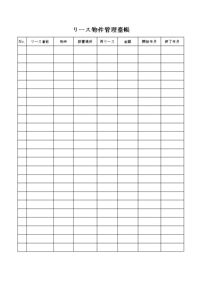 회사명, 물건, 설치장소, 금액, 개시년월, 종료년월 등을 기록하여 관리하는 물건관리대장(일어) 양식입니다.