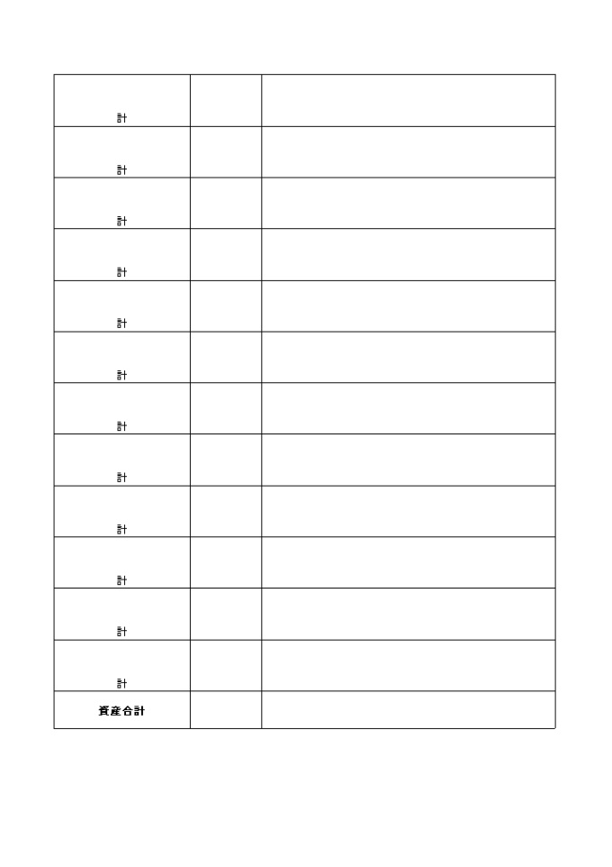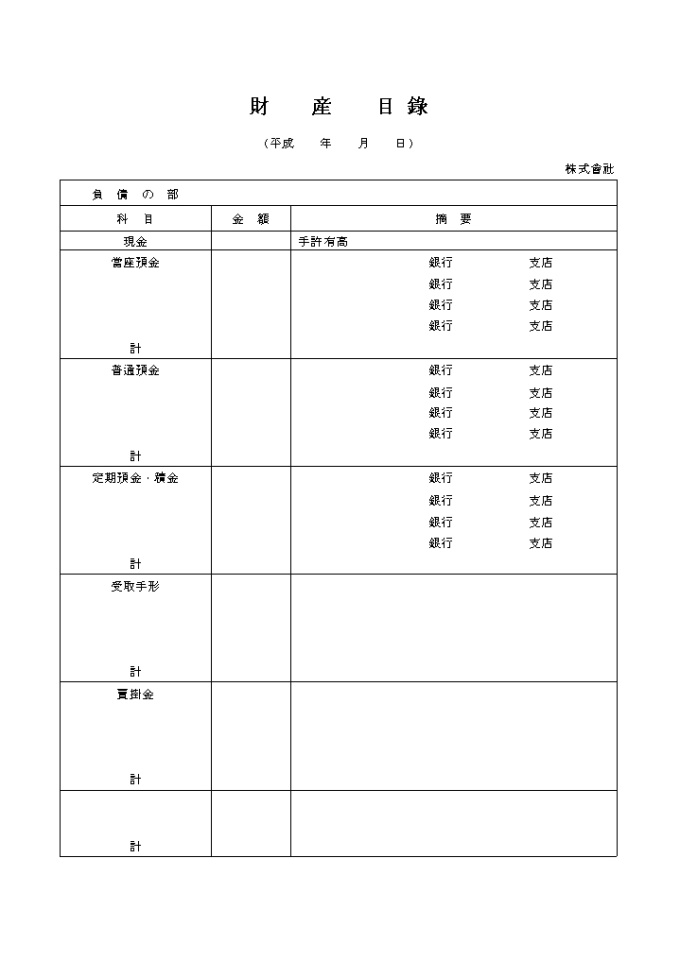과목별 금액 및 적요를 기록하고 재산을 관리하는 재산목록(자산계정)(일어) 양식입니다.
