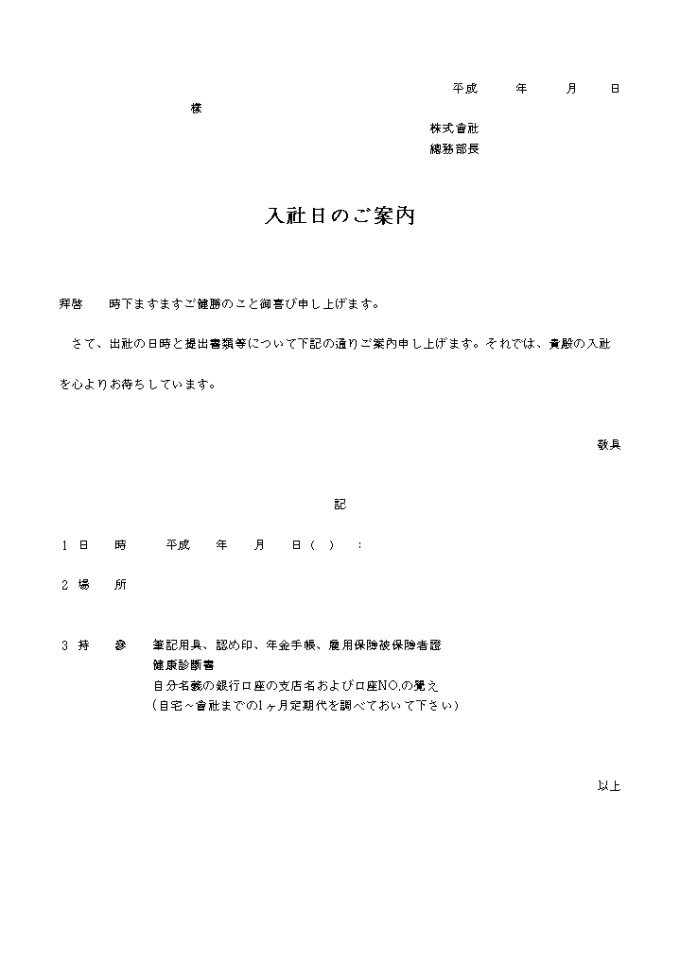 9,000원/월拜啓 時下ますますご健勝のこと御喜び申し上げます. さて, 出社の日時と提出書類等について下記の通りご案內申し上げます.それでは, 貴殿の入社 を心よりお待ちしています. 중도입사안내장(일어) 양식입니다.