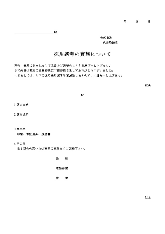 9,000원/월선고일시, 선고장소, 휴대품 등에 대해 기술해 놓은 채용전형의실시에 대하여 (일어) 양식입니다.