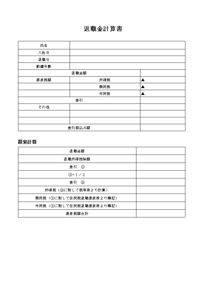 성명, 입사일, 퇴직일, 근속년수, 퇴직금액 등을 기록하여 계산하는 퇴직금계산서(일어) 양식입니다.
