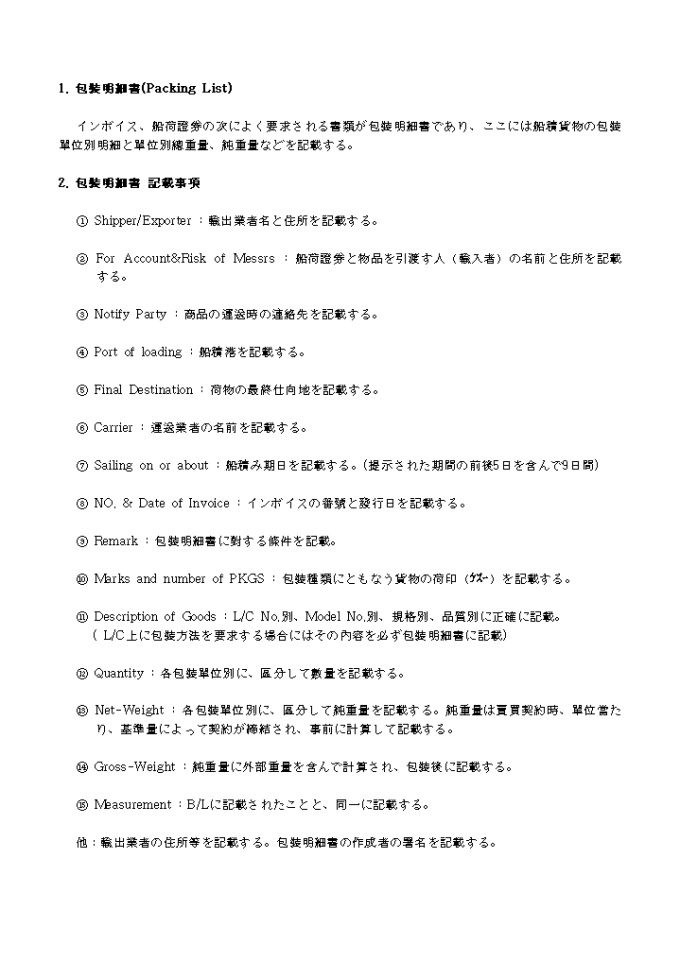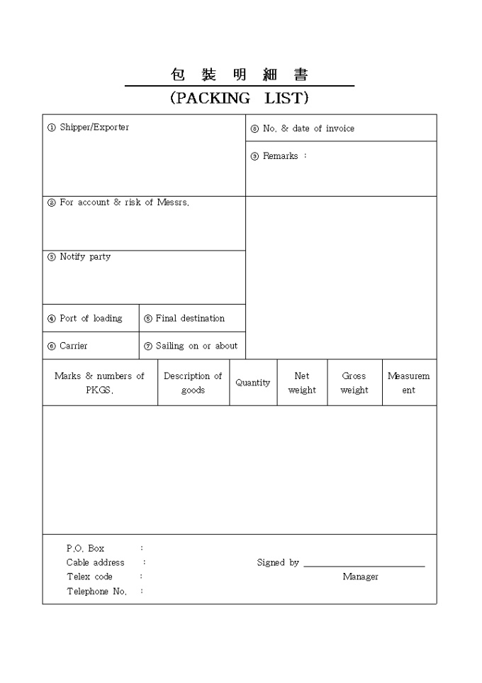 ① Shipper/Exporter ② For account & risk of Messrs. ③ Notify party ④ Port of loading ⑤ Final destination 포장명세서샘플(일어) 양식입니다.