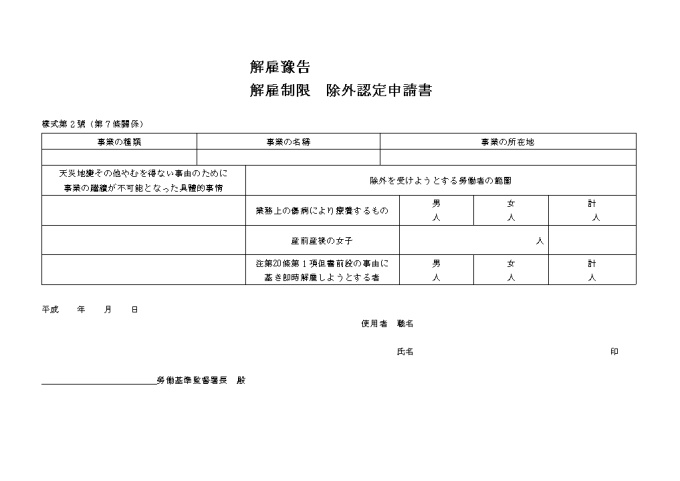 사업의 종류, 사업의 명칭, 사업의 소재지 등을 기록하여 신청하는 해고예고해고제한제외인정신청서(일어) 양식입니다.