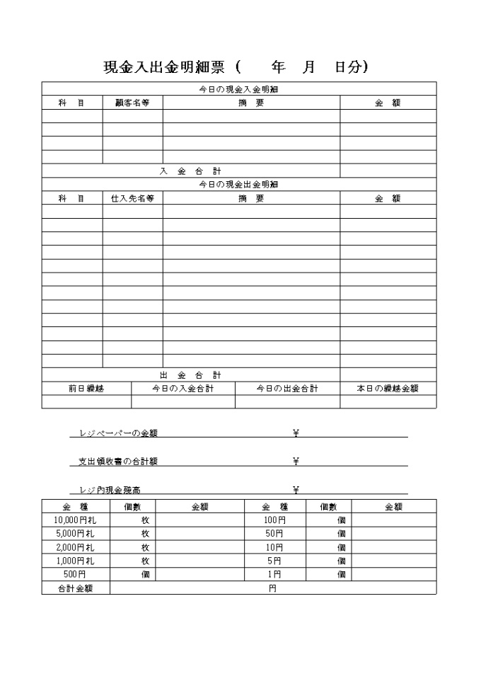 9,000원/월금일 현금입금 및 출금에 대한 명세내용을 기록하는 현금입출금명세표(일어) 양식입니다.