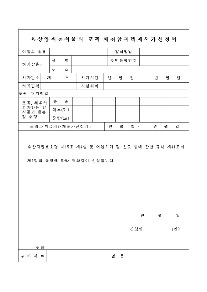 9,000원/월수산자원보호령 제15조 제4항 및 어업허가 및 신고 등에 관한 규칙 제41조의 제1항의 규정에 따라 위와같이 신청하고자 할 때 사용하는 "육상양식동식물의 포획,채취 금지 해제 허가신청서" 양식입닙다.