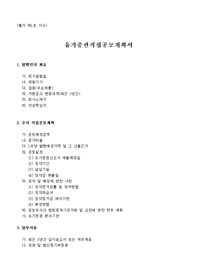 9,000원/월발행인의 개요, 주식 직접공모계획, 첨부서류 항목으로 구성된 유가증권직접공모계획서양식입니다