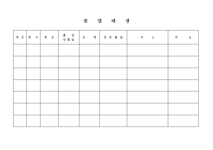 계인, 회수, 번호, 성명, 주소, 적요 등을 기재한 졸업대장 양식입니다.