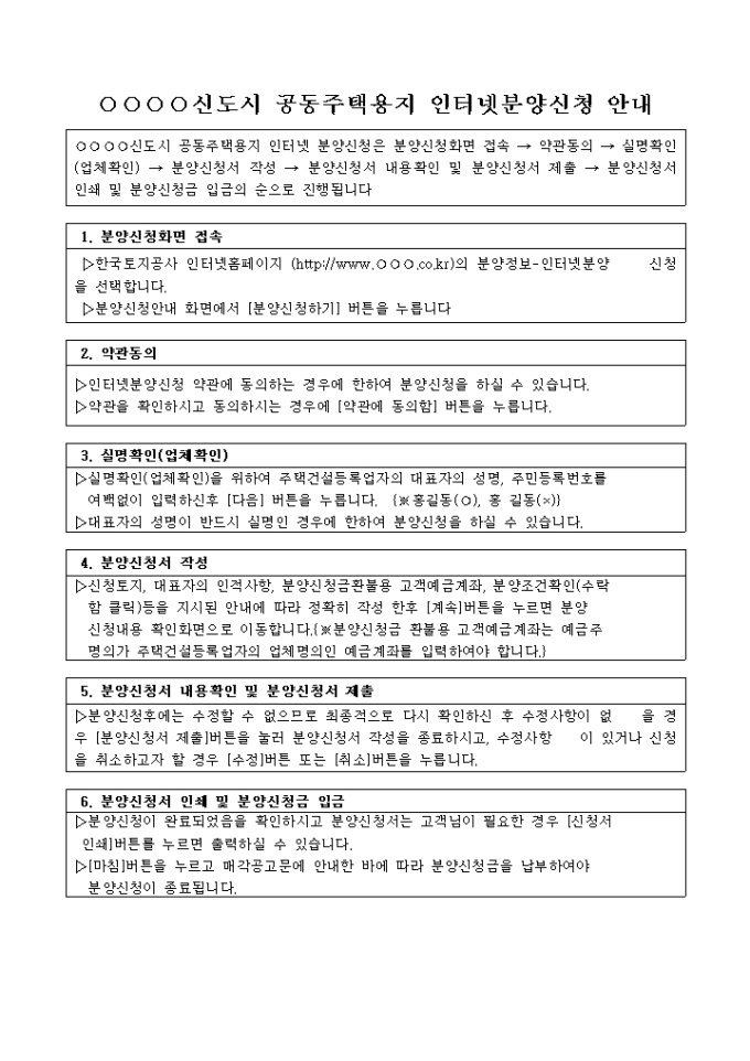 ○○○○신도시 공동주택용지 인터넷 분양신청을 위한 공공주택 후분양 실시(인터넷분양신청안내) 양식입니다.