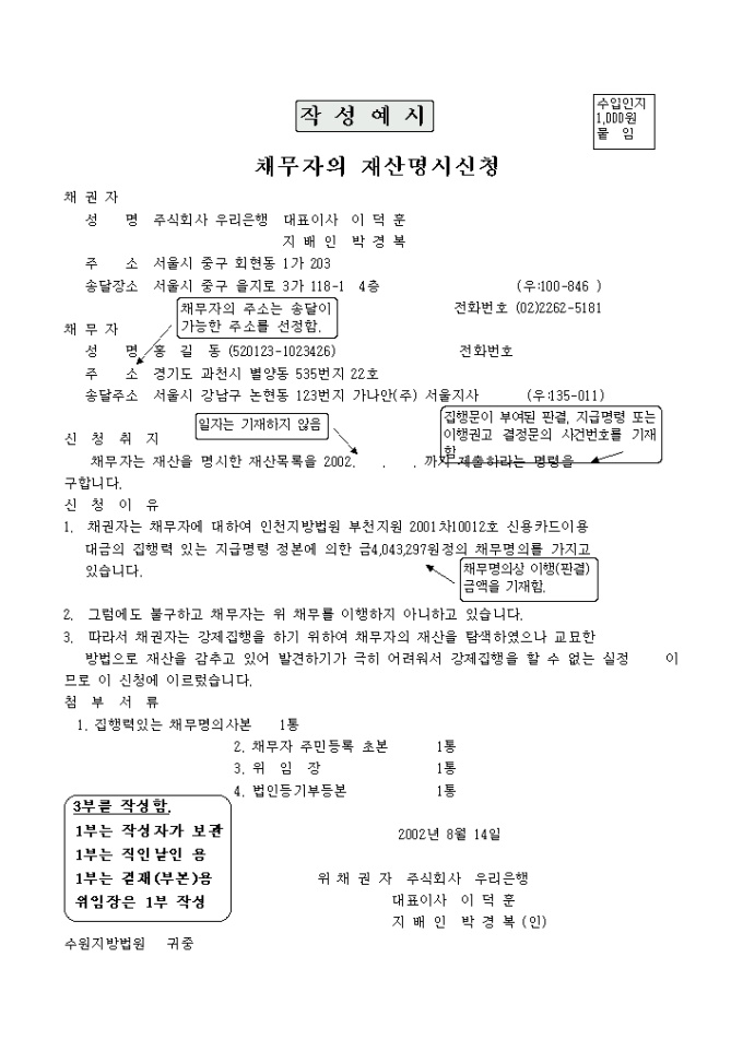 9,000원/월채무자의 재산명시 신청하는 샘플 양식입니다.