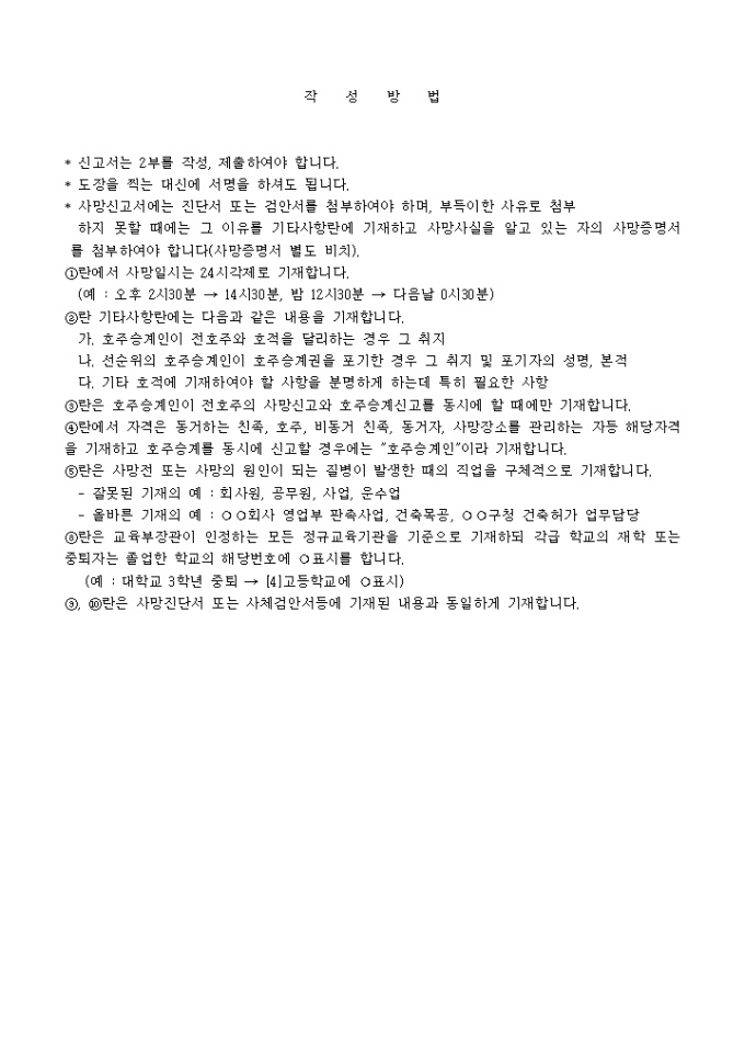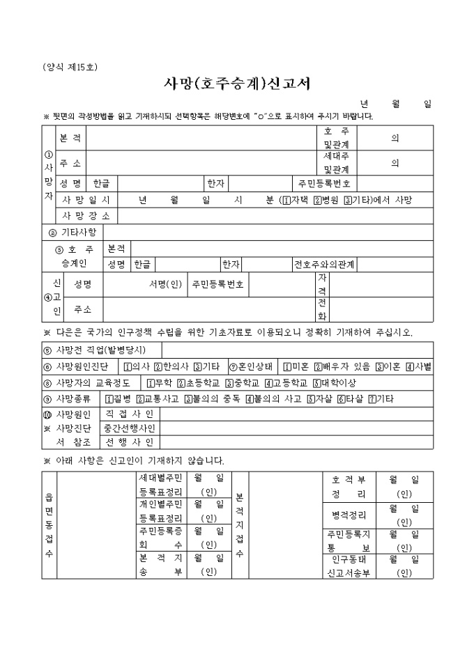 사망으로 인한 동사무소에 신고하는 전동차 객차사이에끼여 승객 사망(사망신고서) 양식입니다.