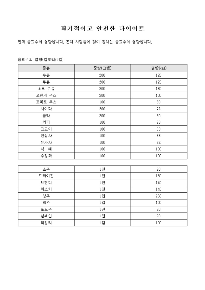 음식별 중량 및 열량이 기술되어 있는 몸짱아줌마 다이어트 수준(획기적이고 안전한 다이어트) 양식입니다.