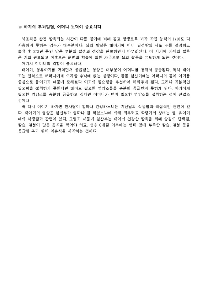 뇌조직은 완전 발육되는 시간이 다른 장기에 비해 길고 평생토록 뇌가 가진 능력의 1/10도 다 사용하지 못하는 경우가 대부분이다. 뇌의 발달은......