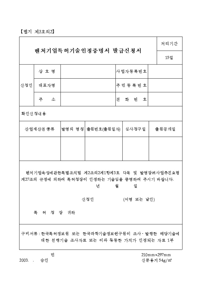 9,000원/월벤처 기업 특허 기술 인정 증명서 발급 신청서 양식입니다. 신청인의 상호명, 사업자등록번호, 대표자명, 주소, 확인신청내용, 산업재산권 종류, 발명의 명칭, 출원번호, 심사청구일, 출원공개일 등을 기재합니다.