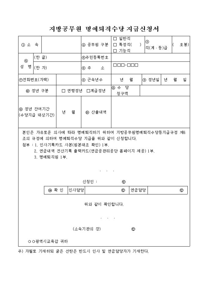 지방공무원 명예퇴직수당 지급신청서