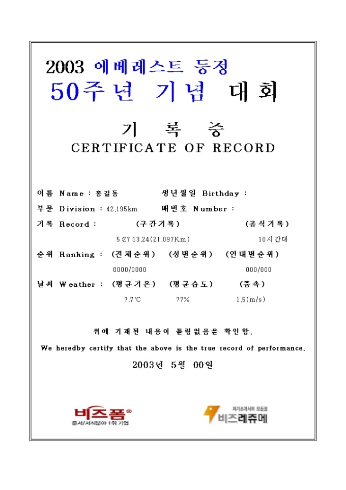 2003 에베레스트 등정 50주년 기념 대회의 기록을 확인하는 한국 85세 노인 에베레스트 산악마라톤 완주(마라톤기록증) 양식입니다.