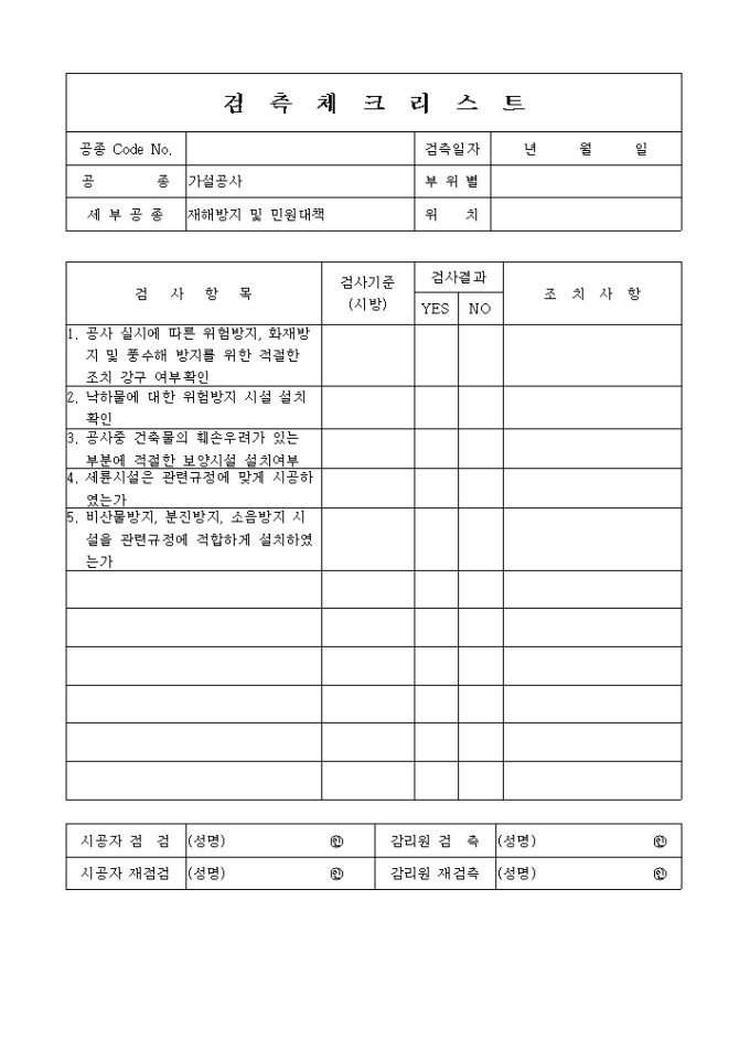 9,000원/월가설공사검측체크리스트(재해방지 및 민원대책)입니다. 검측일자, 부위별, 공종, 부위별, 위치, 세부공종 등을 기재하며, 검사항목에 대한 검사기준 및 검사결과, 조치사항등을 기재합니다.