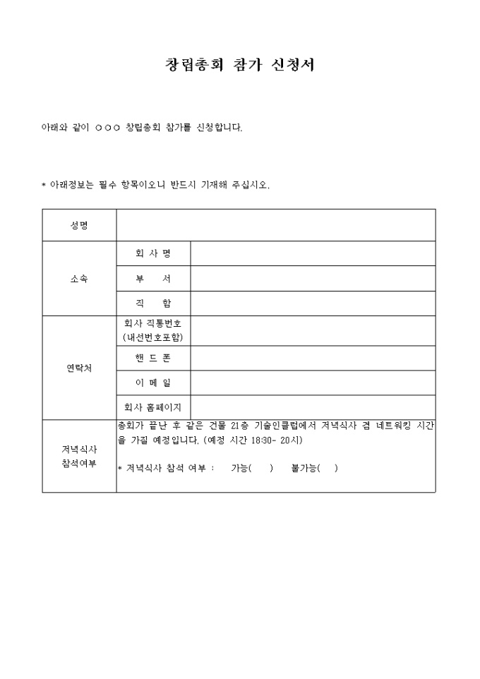 창립총회 참가자의 성명,소속,연락처,저녁식사 참석여부를 기록하는 양식입니다.