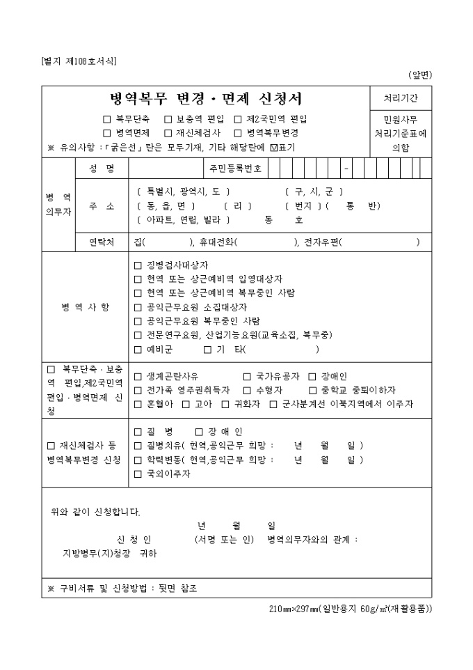 9,000원/월병역의무자 인적사항 및 병역사항, 복무단축 등을 기술하여 병역변경 및 면제를 신청하는 병역복무 변경,면제 신청서 양식입니다.