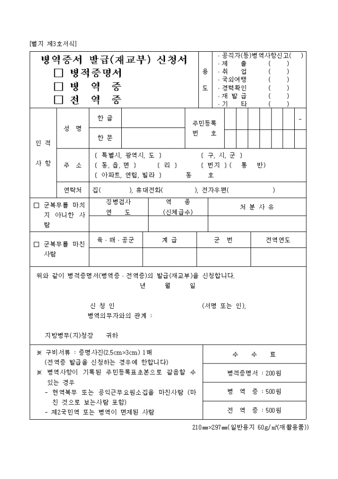 병적증명서(병역증·전역증)의 발급(재교부)을 신청하는 병역증서 발급,재교부 신청서 양식입니다.