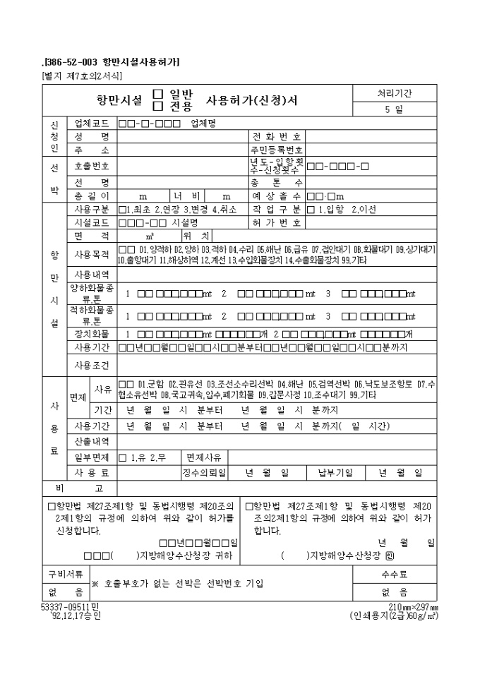 9,000원/월항만법 제27조제1항 및 동법시행령 제20조의2제1항의 규정에 의하여 위와 같이 허가를 신청하고자 할 때 사용하는 "항만시설(일반,전용) 사용허가(신청)서" 양식입니다.