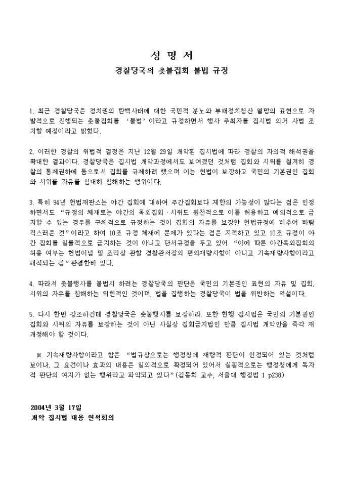 1. 최근 경찰당국은 정치권의 탄핵사태에 대한 국민적 분노와 부패정치청산 열망의 표현으로 자발적으로 진행되는 촛불집회를 ‘불법’이라고 규정하면서 행사 주최자를 집시법 의거 사법 조치할 예정이라고 밝혔다......