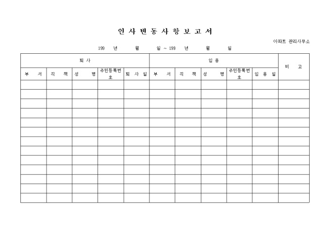 퇴사내역,임용내역을 기록하는 인사변동사항보고서입니다.