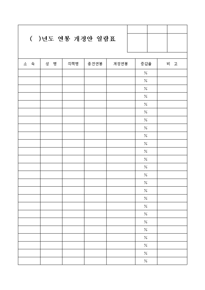 소속, 성명, 직책명, 종전연봉, 개정연봉, 증감율등을 기재하도록 되어 있는 연봉 개정안 일람표 양식입니다.