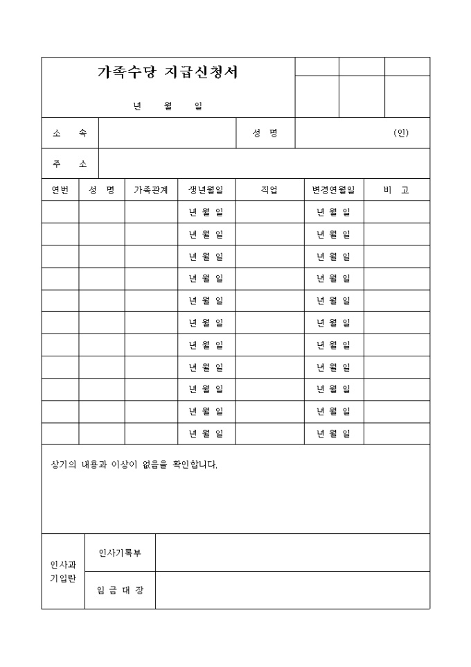 9,000원/월가족수당 신청시 사용하는 양식입니다. 가족성명 및 가족관계, 생년월일등을 기재합니다.
