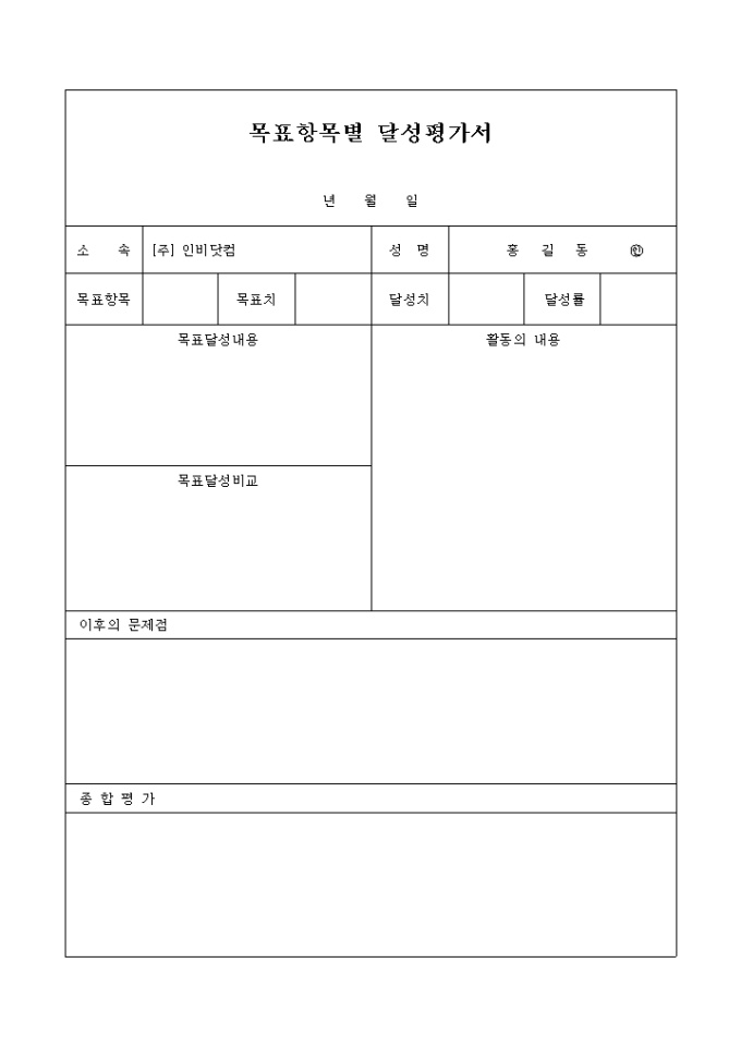 목표항목별 목표치도달내역과 활동내용을 기재하도록 되어 있는 양식입니다.