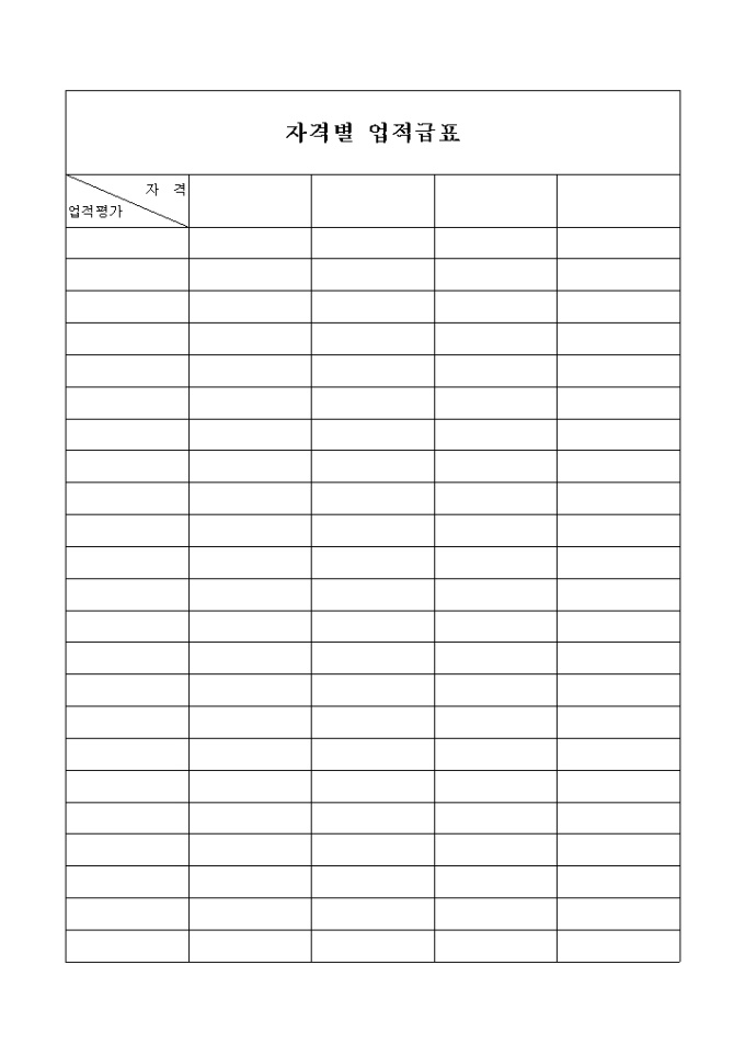 9,000원/월자격별 업적을 평가하는 간략한 양식입니다. 전체 폼으로 만 구성되어 있으므로 내용을 기재하여 사용하세요