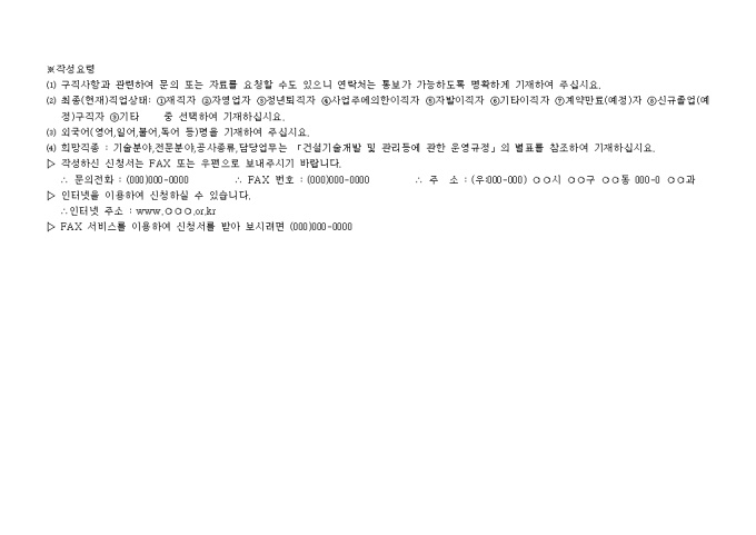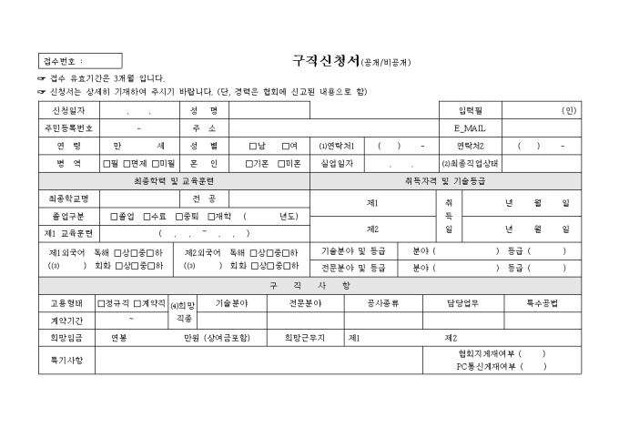 9,000원/월구직자의 인적사항 및 최종학력, 교육훈련, 취득자격 및 기술등급, 구직사항을 기술해 놓은 구직신청서 양식입니다.