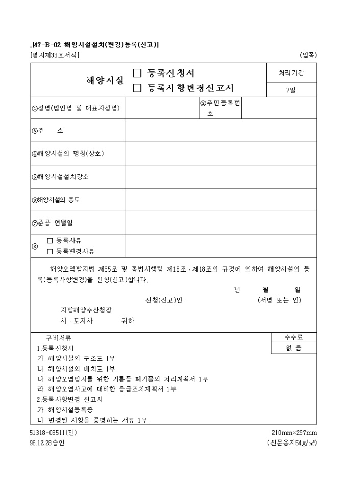 9,000원/월해양오염방지법 제35조 및 동법시행령 제16조․제18조의 규정에 의하여 해양시설의 등록(등록사항변경)을 신청(신고)하고자 할 때 사용하는 "해양시설(등록신청서, 등록사항 변경신고서)" 양식입니다.