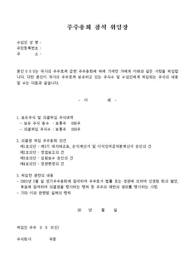 주주총회에 불참석시 기재한 사람에게 권한을 위임할때 사용하는 양식입니다.