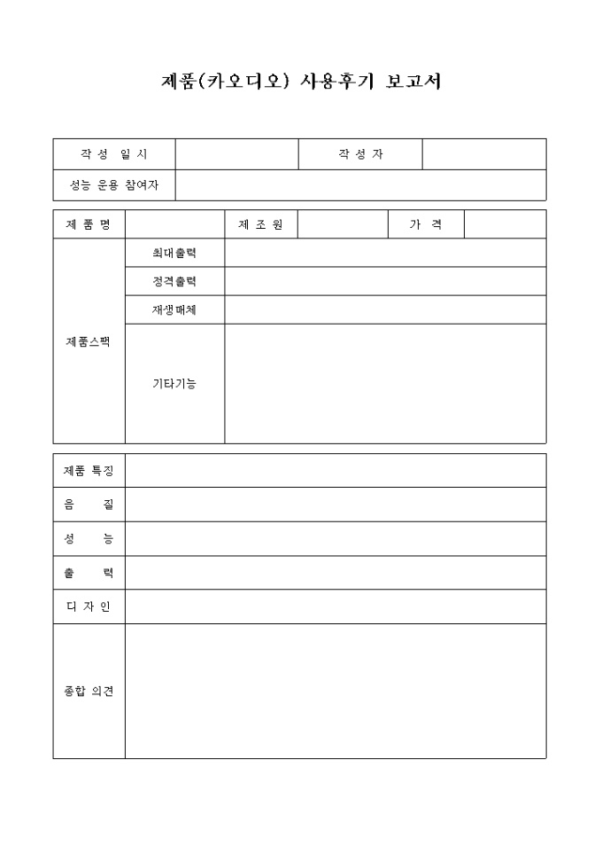 제품 사양 정보 및 사용후기(음질,성능,출력,디자인 등)를 기록할 수 있는 양식입니다.