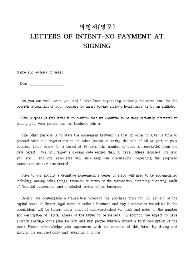 9,000원/월영문 의향서(LOI, NO PAYMENT AT SIGNING)양식입니다.