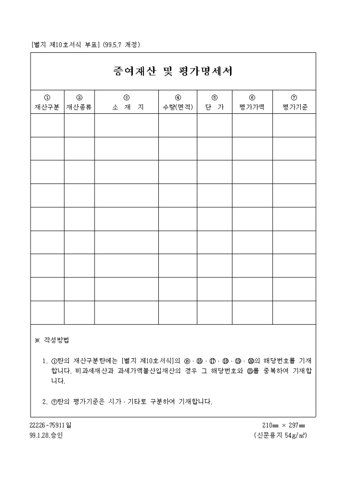 재산구분 및 재사종류, 소재지, 수량, 단가, 평가가액, 평가기준을 기록하여 확인하는 증여재산및평가명세서 양식입니다.