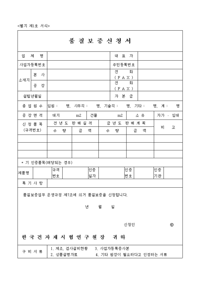 9,000원/월품질보증업무 운영규정 제7조에 의거 품질보증을 신청할때 사용하는 건마크 품질보증지정신청서입니다.