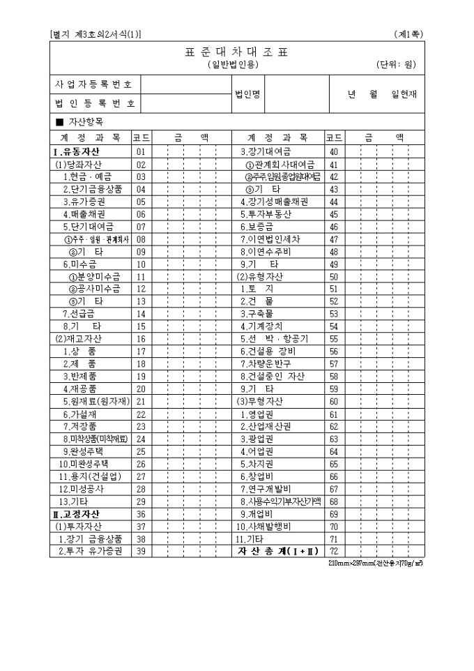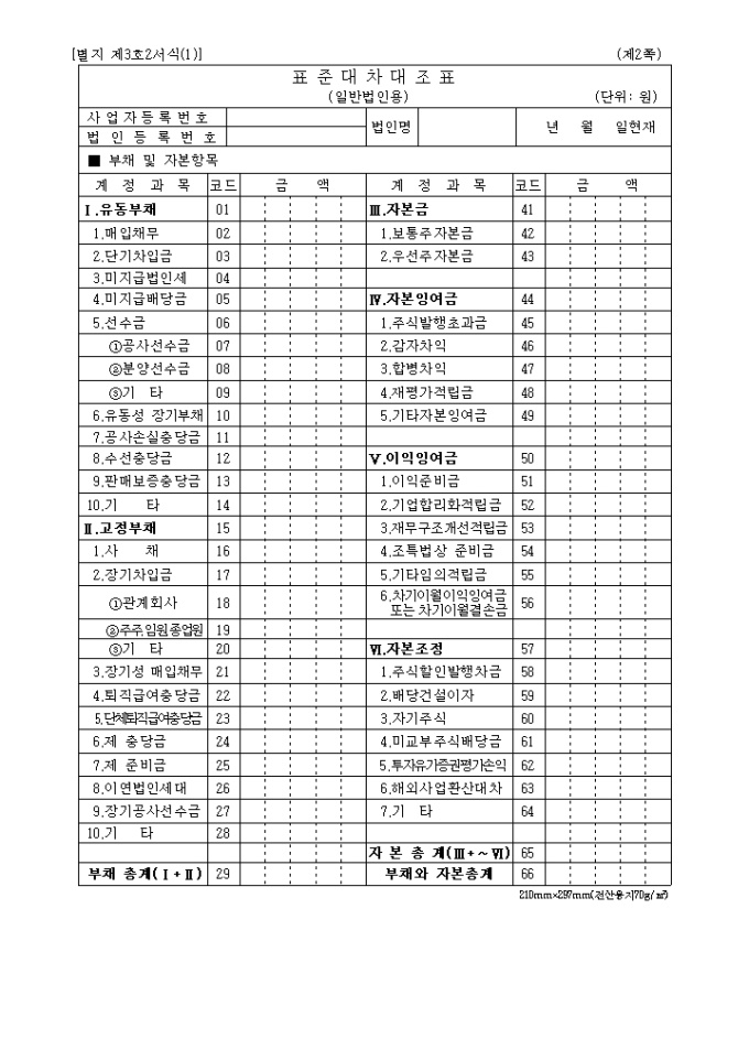 9,000원/월2004년03월05일 개정된 별지 제3호2(1) 표준대차대조표(일반법인용)로 자산항목,부채 및 자본항목의 계정과목,코드,금액을 기록합니다.