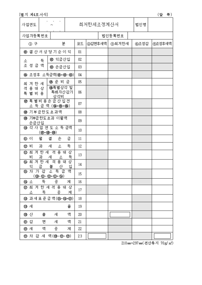 9,000원/월2004년03월05일 개정된 별지 제4호 최저한세조정계산서로 구분,감면후세액,최저한세,조정감,조정후세액을 기록합니다.