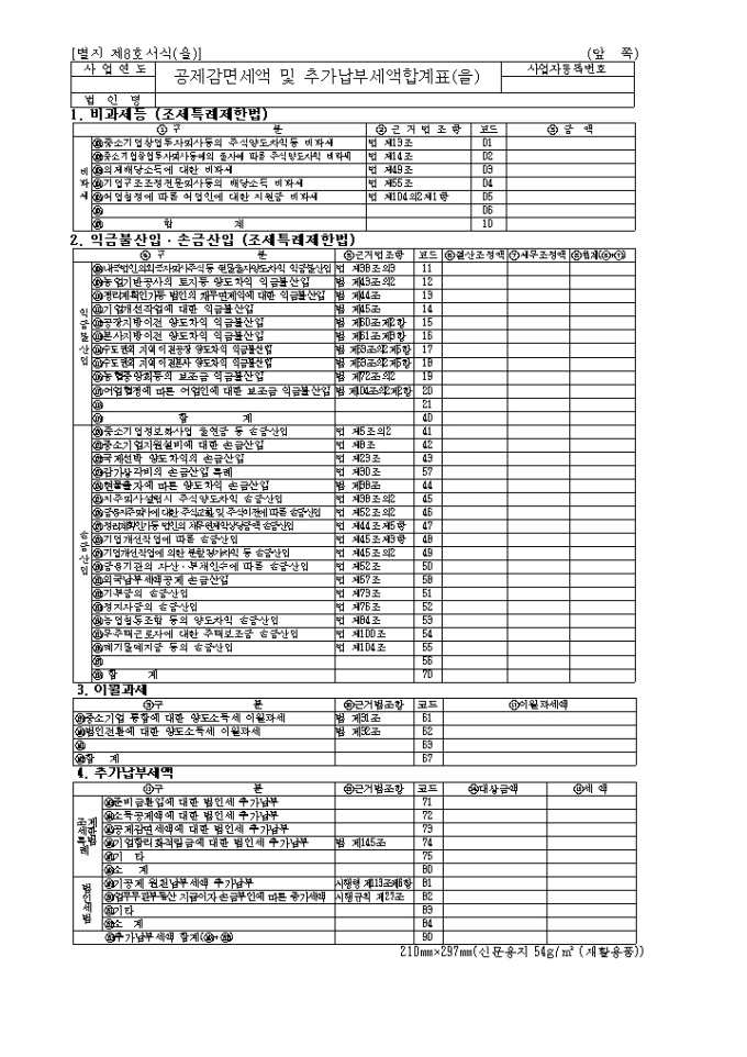 9,000원/월별지 제8호(을) 공제감면세액및추가납부세액합계표(을)로 비과세등,익금불산입,손급산입,이월과세,추가납부세액을 기록하는 양식입니다. (2004년03월05일 개정)