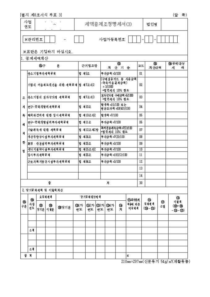 9,000원/월별지 제8호부표3 세액공제조정명세서(3)로 공제세액계산,당기공제세액 및 이월액계산으로 구성되어 있습니다.(2004년03월05일 개정)