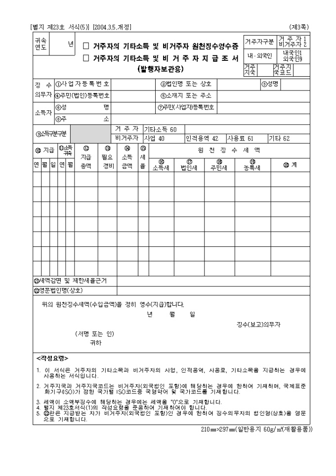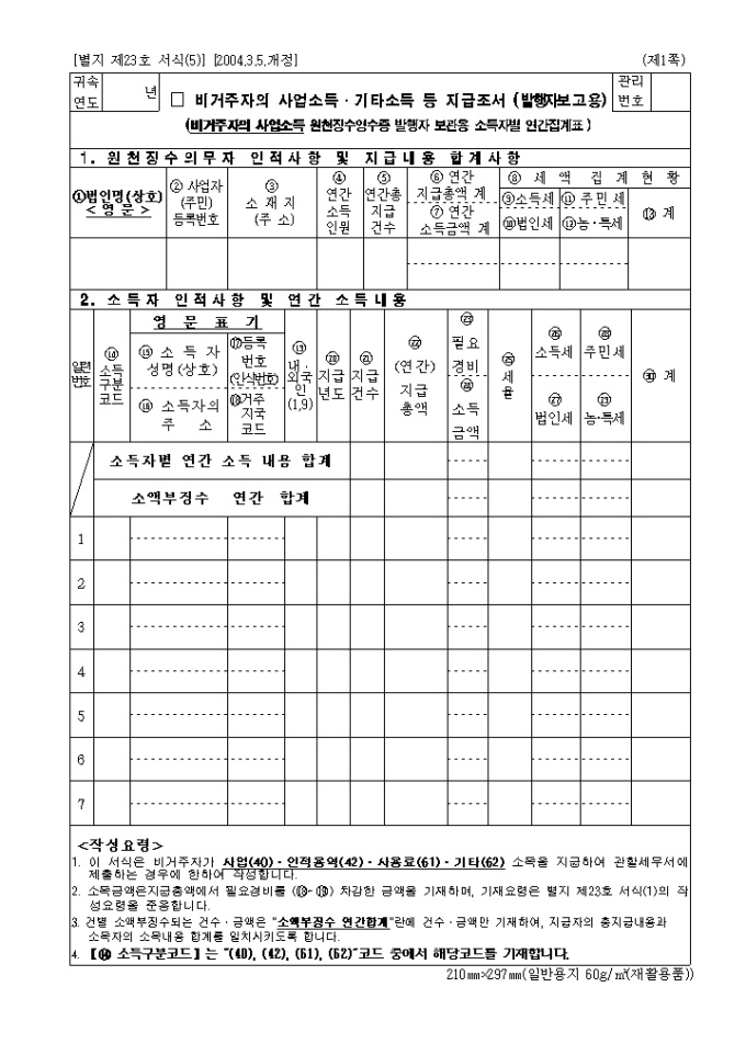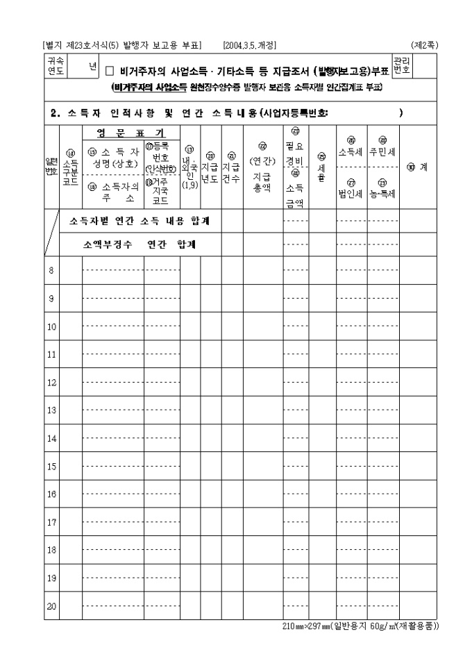 9,000원/월별지 제23호(5) 비거주자의 사업소득·기타소득 등 지급조서로 비거주자의 사업소득 원천징수영수증 발행자 보관용 소득자별 연간집계표입니다. (2004년03월05일 개정)