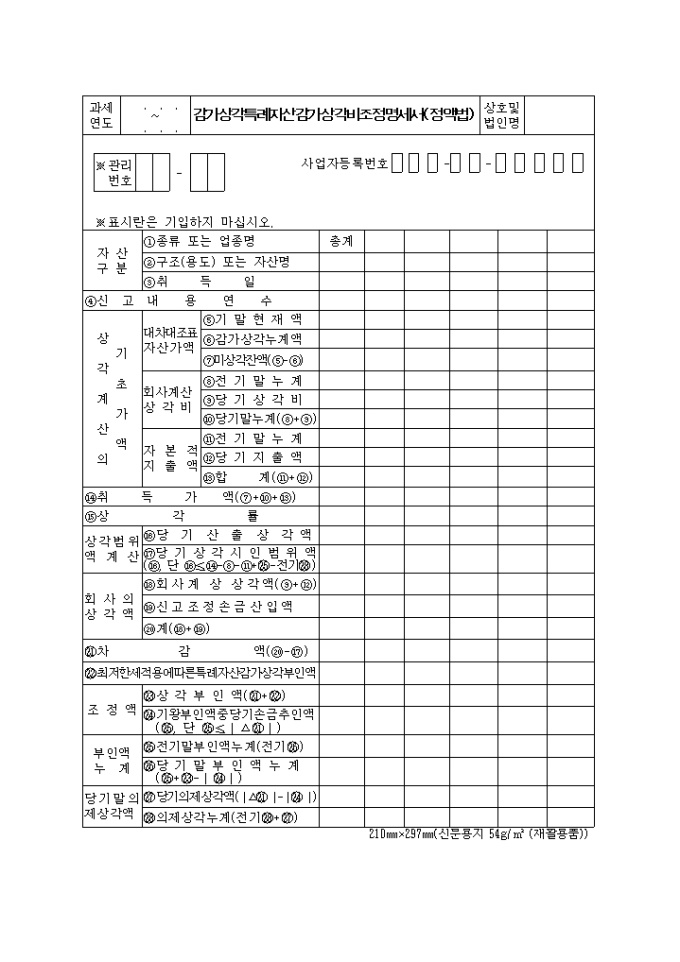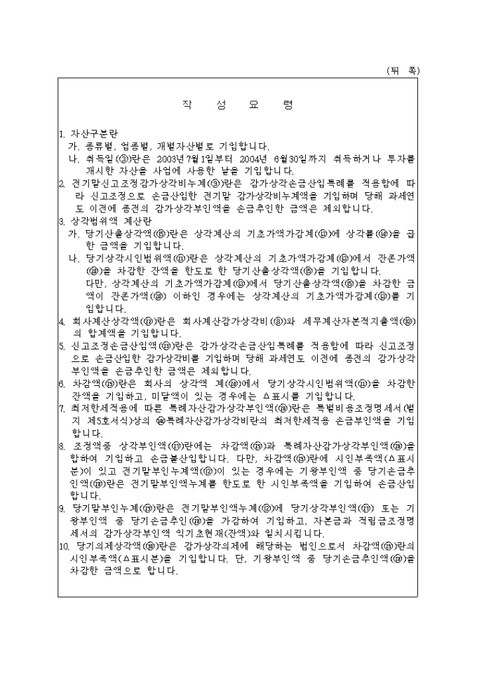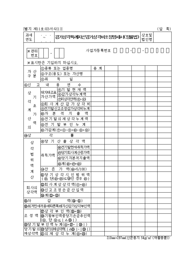 9,000원/월자산구분,상각계산의 기초가액,상각률,상각범위액 계산,회사의 상각액,차감액등을 기록하는 제11호의3(1),(2) 감가상각특례자산감가상각비조정명세서입니다. (2004년03월05일 개정)