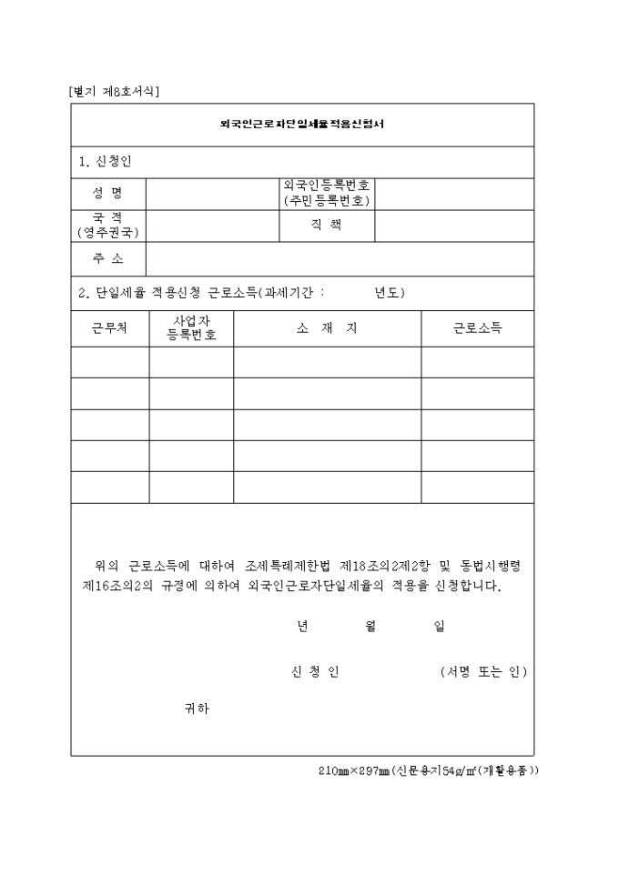 9,000원/월근로소득에 대하여 조세특례제한법 제18조의2제2항 및 동법시행령 제16조의2의 규정에 의하여 외국인근로자단일세율의 적용을 신청할때 사용합니다.