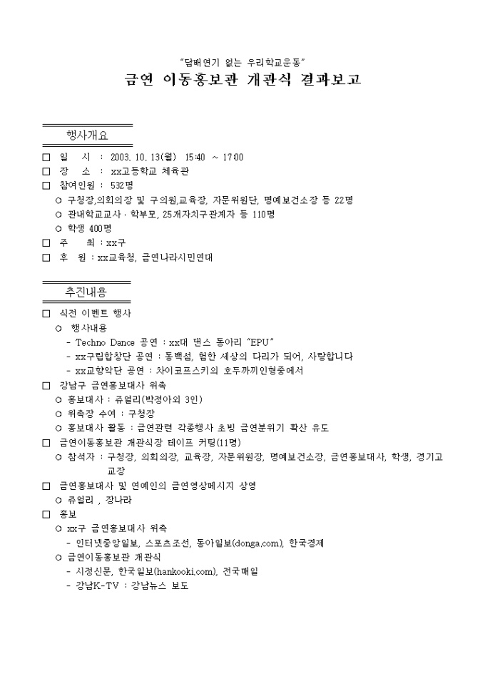 9,000원/월금연 이동홍보관 개관식에 대한 결과를 보고할 때 사용하는 양식입니다. 개관식 결과 보고시 참고하세요